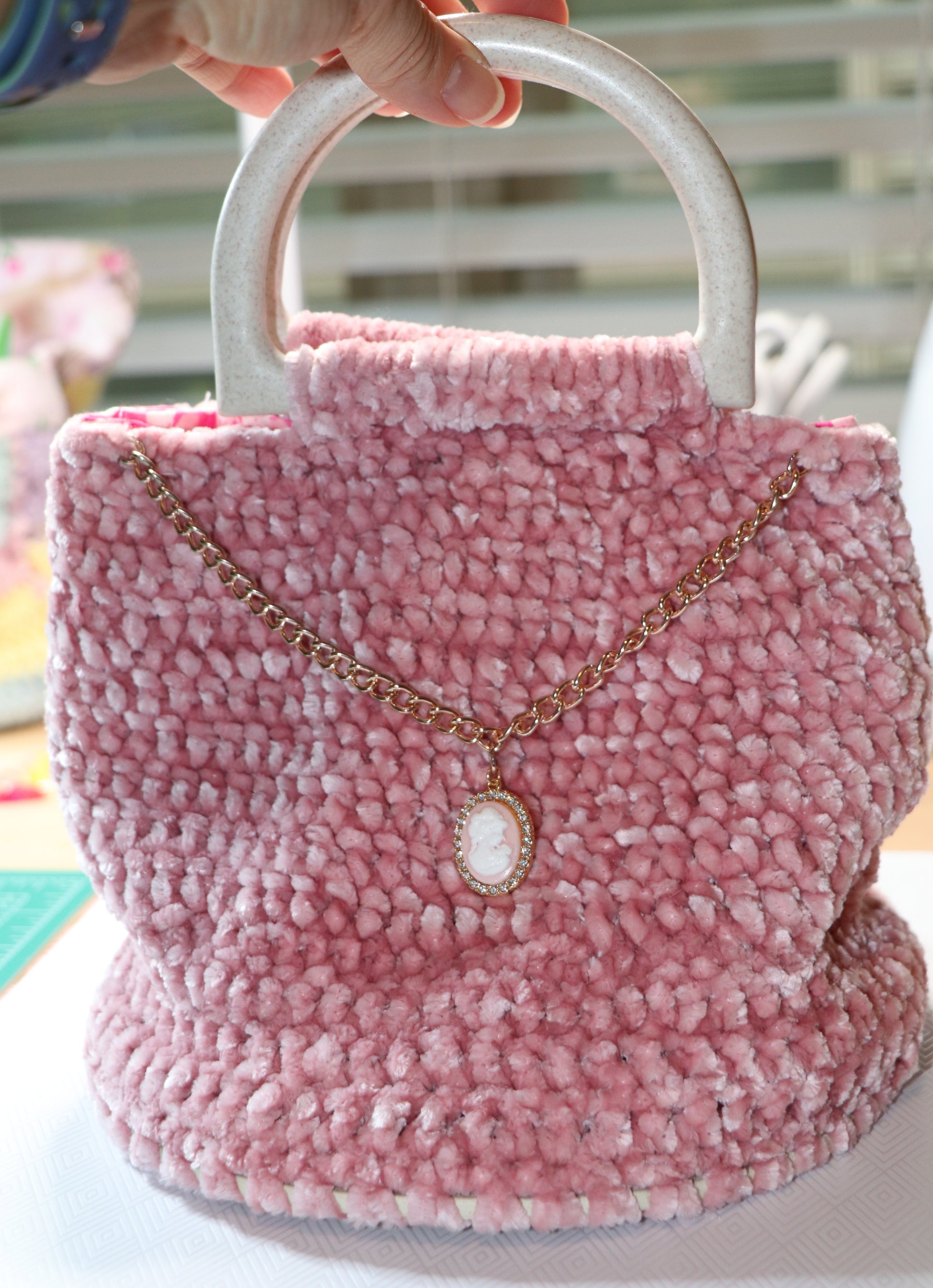 This velvet coin pouch is more than just practical—it’s a statement of elegance in a petite size. Handcrafted with sumptuously soft velvet yarn in quiet pink, it features a structured base, delicate pearl charms, and a shimmering gold chain accent for a refined finish.
